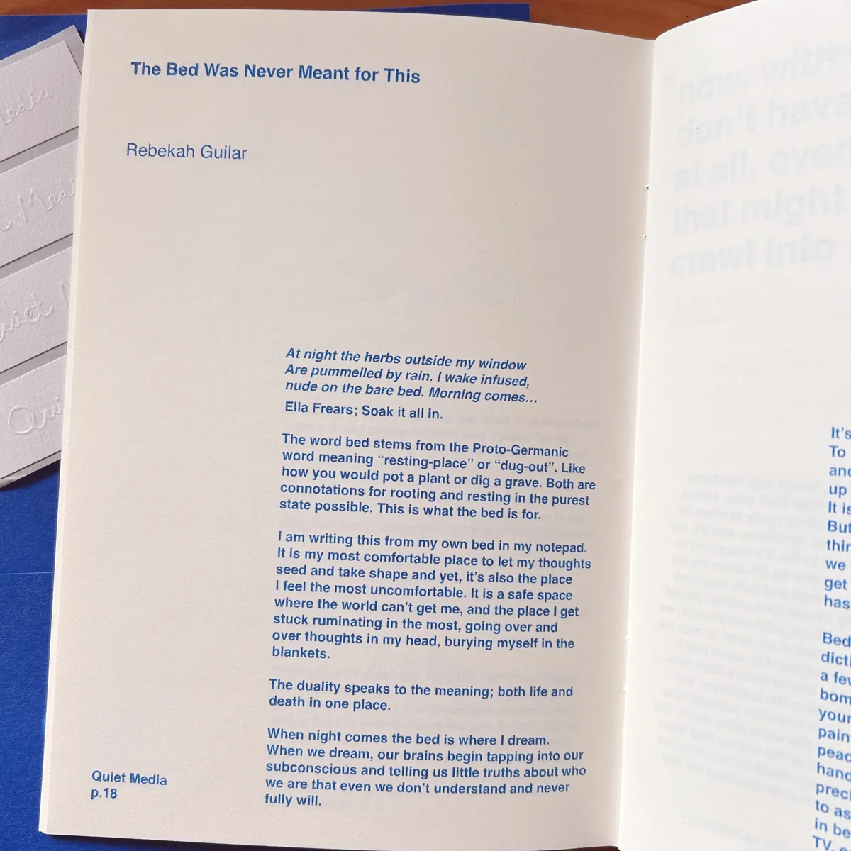 I bought the inaugural zine, Quiet Media by Charlotte Rubesa, and it arrived yesterday. So beautiful. 15 contributors write about design, attention, and creating things with depth > speed. My favorite piece was The Bed Was Never Meant For This by Rebekah Guilar. An essay on how our beds are a place for so much living: sex, love, rumination, and now, bed rotting with our phones.